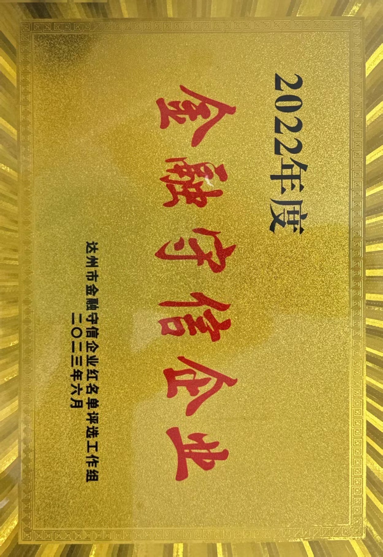 2023年(nian)6月(yue)經(jing)我市(shi)16家行業主管部門嚴格審核并公示無異議,評選出了(le)2022年“金融守(shou)信(xin)企業”紅名單,我司以良(liang)好的(de)信(xin)用管理水平獲此殊榮(rong)。2023年7月4日農業發展銀行(xing)達(da)州分行(xing)正式將牌(pai)匾授予我司(si)。